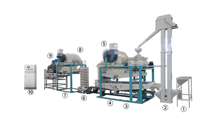 ① 上料斗② 斗式提升機(jī) ③ 脫殼、風(fēng)選、分選主機(jī) ④ 板簧輸送機(jī) ⑤ 立式風(fēng)選系統(tǒng) ⑥ 螺旋提升機(jī) ⑦ 振動(dòng)輸送風(fēng)選機(jī) ⑧ 立式風(fēng)選系統(tǒng) ⑨ 靜電風(fēng)選機(jī) ⑩ 電氣控制柜